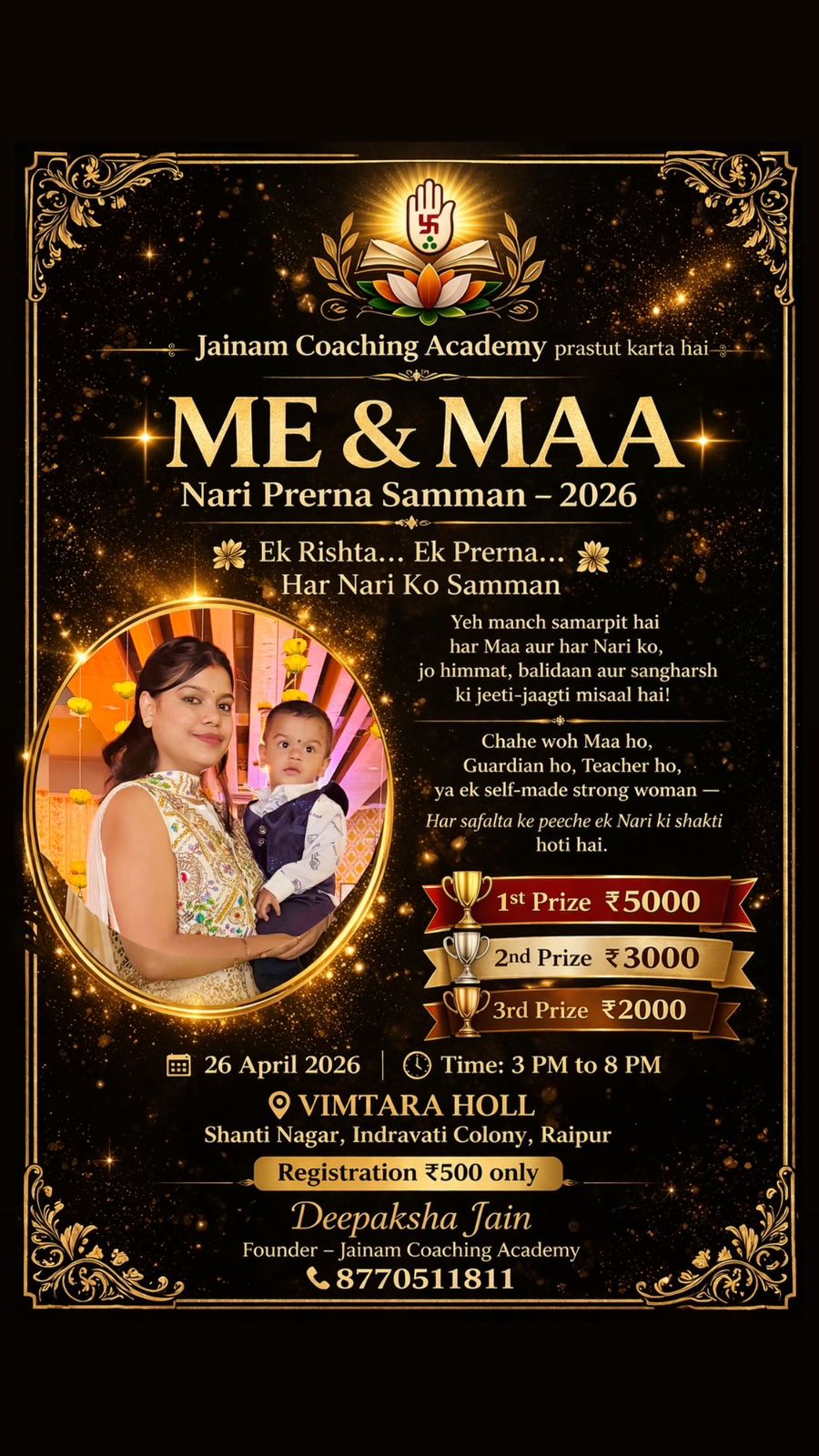 रायपुर (खबरगली) समाज के निर्माण में महिलाओं का संघर्ष और त्याग अक्सर खामोश रह जाता है। इन्हीं अनकही कहानियों को स्वर देने और हर महिला को उसकी विशिष्ट पहचान का एहसास कराने के लिए जैनम कोचिंग अकादमी एक भव्य और भावनात्मक कार्यक्रम “Me & Maa” का आयोजन करने जा रही है। यह आयोजन आगामी 26 अप्रैल को राजधानी के शांति नगर स्थित बिमारा हॉल में दोपहर 3 बजे से आयोजित होगा।