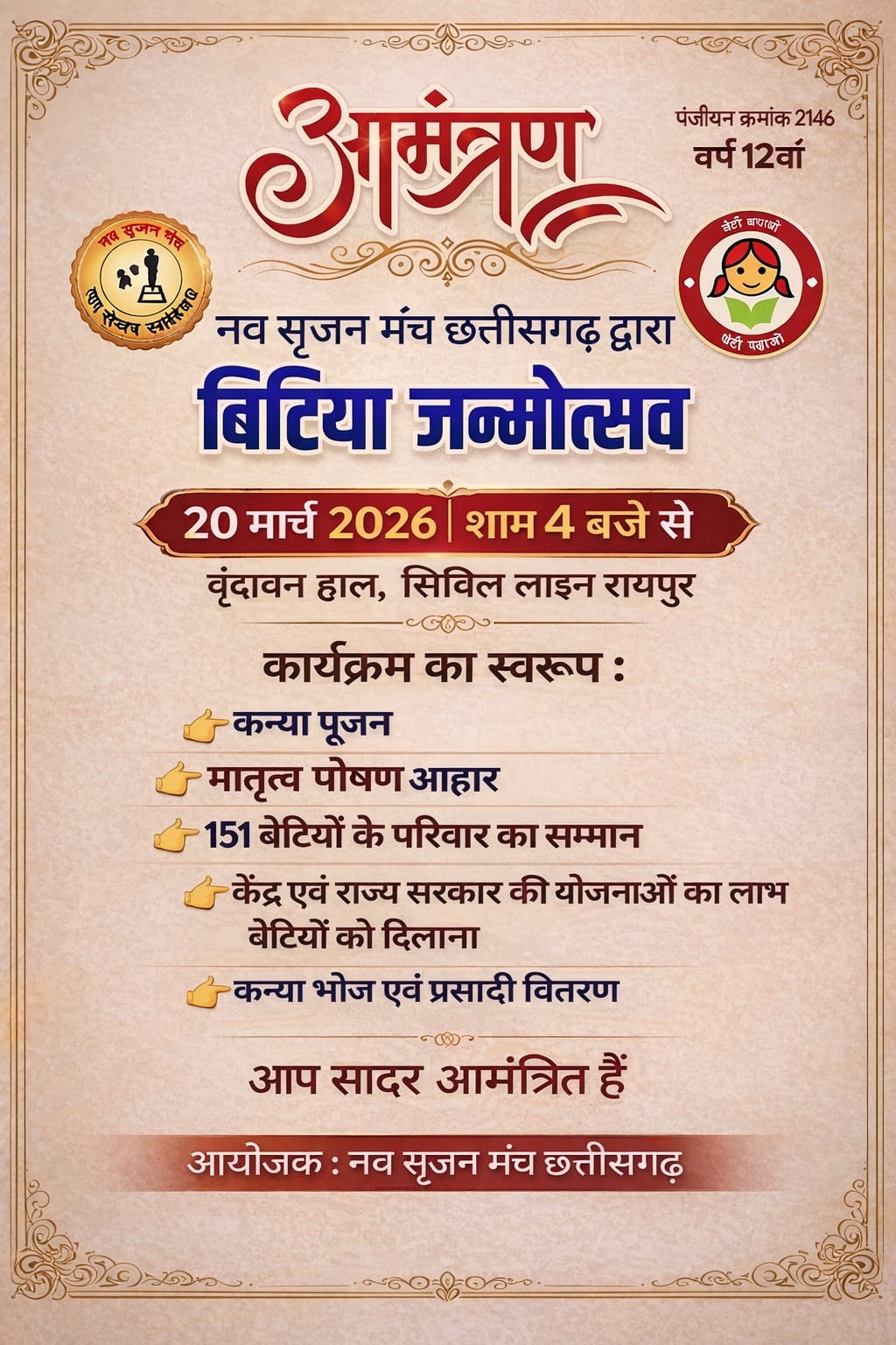 रायपुर (खबरगली ) बेटियों के जन्म को प्रोत्साहित करने और समाज में उनकी गरिमा बढ़ाने के संकल्प के साथ नव सृजन मंच इस वर्ष भी चैत्र नवरात्रि के पावन अवसर पर अपना विशेष कार्यक्रम 'बिटिया जन्मोत्सव' आयोजित करने जा रहा है। पिछले 12 वर्षों से निरंतर जारी यह अभियान इस बार 20 मार्च 2026 को सिविल लाइन स्थित वृंदावन हॉल में संपन्न होगा।