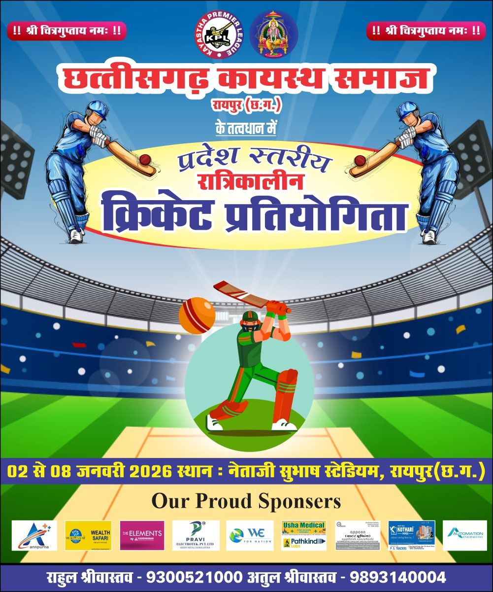 रायपुर (खबरगली) छत्तीसगढ़ कायस्थ समाज के तत्वावधान में प्रतिवर्ष की तरह इस वर्ष भी कायस्थ समाज के युवाओँ के लिए रात्रिक़ालीन कायस्थ प्रीमियर क्रिकेट लीग का आयोजन किया जा रहा है। प्रदेश स्तरीय इस प्रतियोगिता में रायपुर के अलावा दुर्ग, भिलाई, राजनांदगांव, बिलासपुर, बेमेतरा, महासमुंद और डोंगरगढ़ की टीम सम्मिलित होंगी। इस प्रतियोगिता के आयोजक छत्तीसगढ़ कायस्थ समाज हैं यह स्पर्धा नेताजी सुभाष स्टेडियम में दिनांक 02 जनवरी से का से 08 जनवरी तक रात्रिक़ालीन समय में खेली जा रही है प्रतिदिन मैच शाम 6 बजे से प्रारंभ होंगे ।