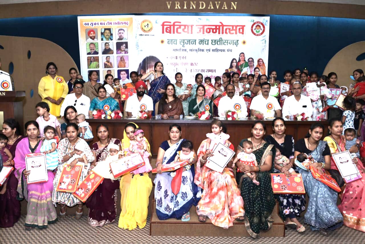 रायपुर (रायपुर) प्रदेश की प्रतिष्ठित सामाजिक संस्था नवसृजन मंच द्वारा बिटिया जन्मोत्सव का आयोजन किया गया 10 दिन से लेकर 6 माह तक की बिटिया गोद में लिए माता पिता सम्मान समारोह में पहुंचे सामाजिक संस्था नवसृजन मंच द्वारा आयोजित बिटिया जन्मोत्सव आयोजन के अंतर्गत 201 बेटियों के माता पिता का सम्मान किया गया। संस्था नवसृजन के प्रदेश अध्यक्ष अमरजीत सिंह छाबड़ा ने बताया की बेटियों के जन्म को प्रोत्साहित करने संस्था पिछले 10 वर्षों से यह आयोजन करती आ रही है जिसमे अब तक हजारों परिवारों को इस आयोजन के अन्तर्गत सम्मानित किया जा चुका है।