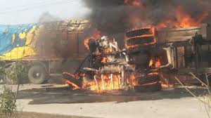 गिरिडीह (खबरगली) झारखंड के गिरिडीह जिले के डुमरी थाना क्षेत्र अंतर्गत कुलगो टोल प्लाजा के पास गुरुवार सुबह एक हृदयविदारक सड़क हादसे में दो लोगों की जिंदा जलकर मौत हो गई। जानकारी के अनुसार, सड़क किनारे खड़े दो ट्रकों को एक अनियंत्रित ट्रक ने जोरदार टक्कर मार दी, जिसके बाद तीनों वाहनों में भीषण आग लग गई। आग की लपटें इतनी तेज थीं कि एक ट्रक के चालक और खलासी को वाहन से बाहर निकलने का मौका तक नहीं मिला और उनकी मौके पर ही जलकर मौत हो गई।