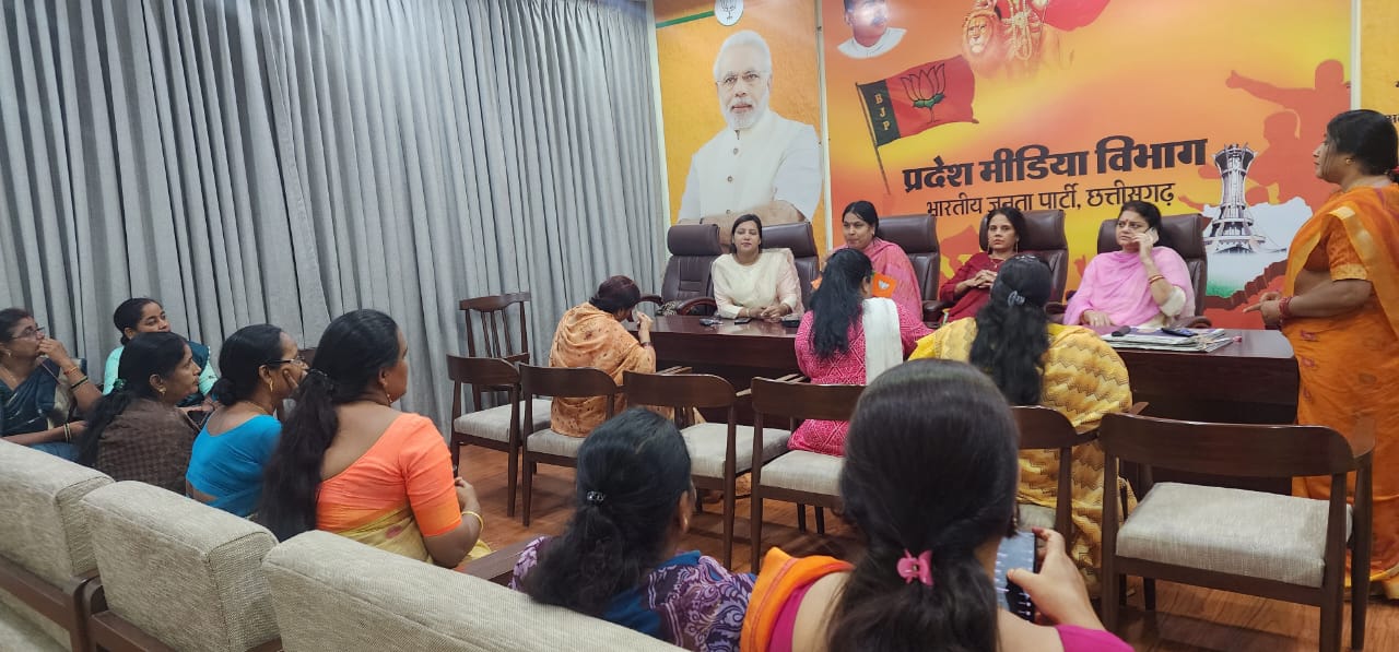 इसकी तैयारी के मद्देनजर एकात्म परिसर में महिला मोर्चा की बैठक आहूत की गई जिसमें विशेष रूप से महिला मोर्चा प्रदेश उपाध्यक्ष एवं नेता प्रतिपक्ष मीनल चौबे , महामंत्री विभा अवस्थी जी, संध्या तिवारी ,सोशल मीडिया प्रभारी कृतिका जैन, मिनी पांडे, रायपुर शहर एवं ग्रामीण की महिला मोर्चा की पदाधिकारी बहने एवं कार्यकर्ता उपस्थित थी।