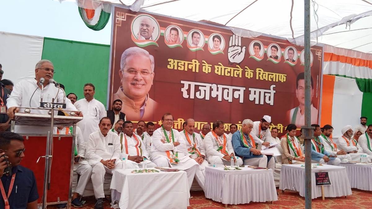 रायपुर (khabargali) अदाणी समूह के समर्थन में केंद्र की नीतियों के खिलाफ कांग्रेस ने सोमवार को राजभवन मार्च से पहले अंबेडकर चौक पर एक सभा की। यहां कांग्रेस के सभी नेता एकत्र हुए पश्चात,सभी नेताओं ने राजभवन की ओर मार्च किया। कांग्रेस की प्रदेश प्रभारी कुमारी सैलजा, मुख्यमंत्री भूपेश बघेल,प्रदेश अध्यक्ष मोहन मरकाम के साथ मंत्री-विधायक व संगठन के पदाधिकारी मौजूद थे। केन्द्र की अडानी परस्ती वाली नीति के विरोध में कांग्रेस का ये प्रदर्शन देशभर में हो रहा है।