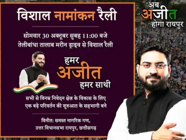 रायपुर (khabargali) टिकट वितरण के बाद कांग्रेस में शुरू हुई बग़ावत थमने का नाम नहीं ले रही है। टिकट नहीं मिलने की वजह से सराईपाली के वर्तमान विधायक सहित कई कांग्रेसी नेता पार्टी छोड़ चुके हैं। वहीं अब रायपुर उत्तर सीट में भी कांग्रेस के लिए मुश्किलें खड़ी होती नजर आ रही है। दरअसल कांग्रेस पार्षद और एमआईसी सदस्य अजीत कुकरेजा अब निर्दलीय चुनाव लडऩे की तैयारी कर रहे हैं। उन्होंने दो नामांकन फ़ॉर्म लिए हैं। कल यानि की 30 तारीख को सुबह 10.30 दस बजे वो तेलीबांधा से रैली निकालेंगे। रैली के बाद निर्दलीय प्रत्याशी के रूप में अपना नामांकन दाखिल करेंगे। उन्होंने विशाल नामांकन रैली के पोस्टर जारी किया है जो सोशल मीडिया में वायरल हो रहा है।
