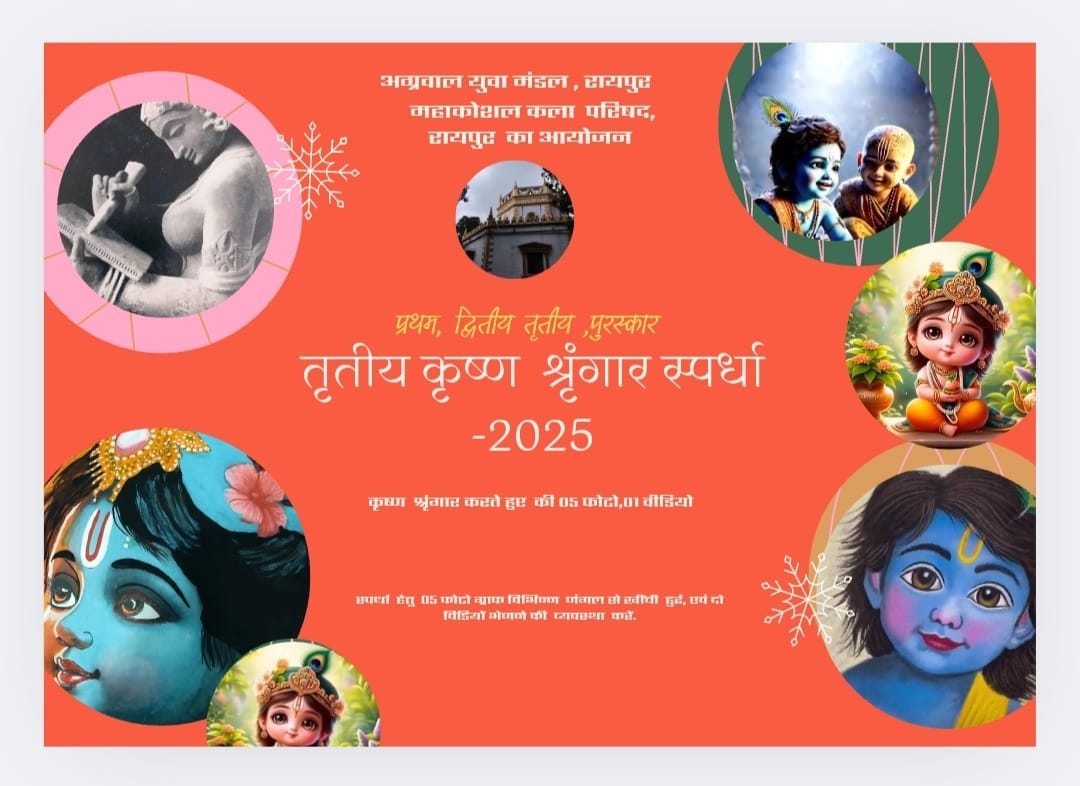 रायपुर (खबरगली) महाकोशल कला परिषद ,रायपुर , अग्रवाल युवा मंडल,गौड़ ब्राह्मण समाज संस्था, , महाकोशल कल्याण प्रसाद शर्मा ललित कला महाविद्यालय ,रायपुर, छत्तीसगढ़ राज्य फोटोग्राफर वेलफेयर एसोसिएशन,रायपुर,द अमित चौहान फोटो स्टोरी,स्कान मंदिर,रायपुर के द्वारा भगवान् कृष्ण जन्माष्टमी के अवसर पर आज भगवान् कृष्ण या लड्डु गोपाल श्रृंगार स्पर्धा -2025 का आन लाईन आयोजन विभिन्न आयु वर्ग में समाज सेवी घनश्याम शर्मा की स्मृति में किया जा रहा है यह आन लाईन स्पर्धा रात 01:00 बजे तक चलेगी।