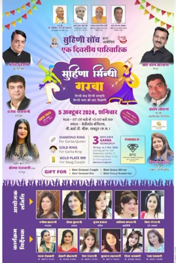 रायपुर (khabargali) होटल बेबीलॉन कैपिटल में पारिवारिक "सुहिणा सिंधी गरबा" समाज के लिए आयोजित करवा रही है सुहिणी सोच संस्था 5 अक्टूबर समय 7 से 10 बजे तक , वीआई पी चौक , होटल बेबीलॉन केपिटल में ऐअरकंडीशनर वातावरण में होगा एक दिवसीय पारिवारिक गरबा सुहिणी सोच संस्था की संस्थापक श्रीमती मनीषा तारवानी एवं संस्था की अध्यक्ष श्रीमती दीक्षा बुधवानी के सानिध्य में सम्पन्न होगा इस कार्यक्रम को मनोरजकारी तथा आनंदमय बनाने के लिए संस्था की सचिव पूनम बजाज जी ने बताया कि प्रतियोगिताओं व प्रतिभागियों के लिएआकर्षक उपहार,आनंदित गेम्स का भी वर्णन किया ।