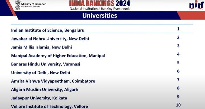 NIRF Ranking 2024 (khabargali) NIRF रैंकिंग 2024 में भारतीय विज्ञान संस्थान (बेंगलुरु) को देश का सर्वश्रेष्ठ विश्वविद्यालय बताया गया है, दूसरे नंबर पर जवाहरलाल नेहरू विश्वविद्यालय दिल्ली और तीसरे नंबर पर जामिया मिलिया इस्लामिया का स्थान है।