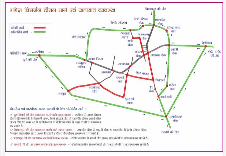 30 सितंबर से 1 अक्टूबर तक गणेश विसर्जन कार्यक्रम के दौरान सभी प्रकार के माल वाहक वाहनों का आवागमन रायपुरा चौक से महादेव घाट अमलेश्वर नदी पुल तक रोक दिया जावेगा, जिन्हे अमलेश्वर से रायपुर की ओर आवागमन करना है वे अमलेश्वर कुम्हारी - टाटीबंध होकर अथवा खुड़मुड़ा भाठागांव- भाठागांव चौक होकर आवागमन कर सकते हैं। 30 सितंबर को को मुख्य गणेश विसर्जन चल समारोह के दौरान जन समुदाय की उपस्थिति की सुरक्षा तथा आवागमन को सुचारू बनाये रखने हेतु चल समारोह मार्ग पर सभी प्रकार के मालवाहक वाहनों का आवागमन एवं पार्किंग पूर्णत: प्रतिबंधित रहेगा।