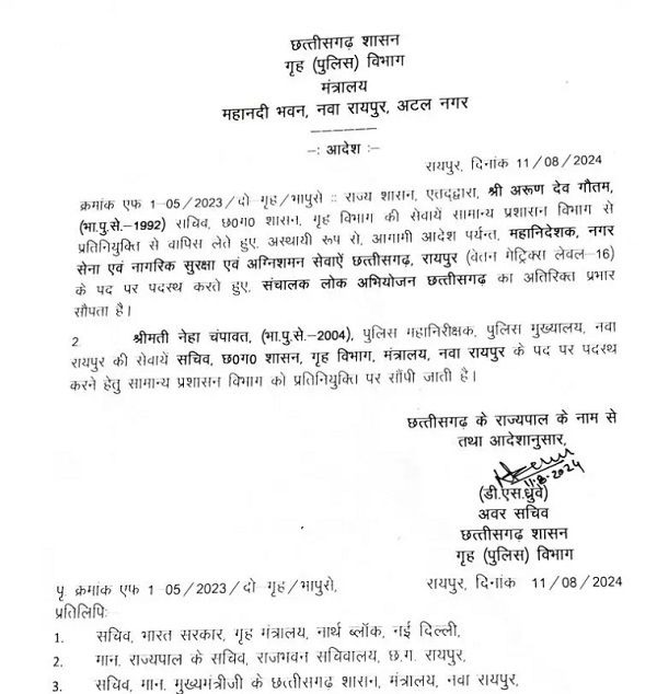 रायपुर (khabargali) राज्य शासन ने 2 आईपीएस अधिकारियों का तबादला किया है, गृह विभाग द्वारा जारी आदेश के मुताबिक आईपीएस अरुण देव गौतम और नेहा चंपावत के तबादले किए गए हैं।