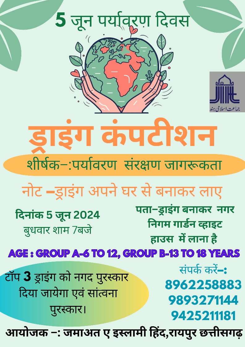 रायपुर (khabargali) जमाअत ए इस्लाम हिंद,रायपुर के द्वारा पर्यावरण जागरूकता अभियान के तहत 5 जून 2024 को विश्व पर्यावरण दिवस के दिन ड्राइंग कॉम्पटीशन रखा गया है जिसका का शीर्षक "पर्यावरण संरक्षण जागरूकता" है जिसको दो वर्गों में बांटा गया है ग्रुप ए 6 से 12 साल और ग्रुप भी 13 से 18 साल तक। ड्राइंग प्रतियोगिता में भाग लेने वाले प्रतिभागियों को टॉप 3 ड्राइंग को नगद पुरस्कार एवम भाग लेने वालो को सांत्वना पुरस्कार दिया जाएगा।