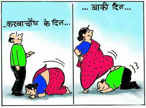 रायपुर (खबरगली) करवा चौथ भारतीय महिलाओं के प्रमुख त्योहारों में से एक माना जाता है. इस दिन सुहागिन महिलाएं अपने पति के लंबी उम्र और अच्छे सेहत की कामना के लिए निर्जल व्रत रखती हैं और पूजा करती हैं. इसके बाद वो रात में चांद देखने के बाद अपना व्रत तोड़ती हैं और कुछ खाती हैं। फेसबुक से लेकर व्हाट्सएप , इंस्टाग्राम तक करवा चौथ को लेकर एक से बढ़कर एक जोक्स सोशल मीडिया पर देखने -पढ़ने को भी मिल रहे हैं. इस दिन पति पत्नियों को लेकर मजेदार कार्टून , फनी एडिटेड तस्वीरें और शेरों- शायरी के आलावा जोक्स खूब वायरल होते हैं। कुछ में वीडियो, फोटो और मीम्स में पतियों की खिंचाई हो रही होती है तो कुछ नें पत्नियों को पति द्वारा छेड़ते और चिढ़ाते हुए देखा जाता है. इसके अलावा इसके सब को करवा चौथ की शुभकामानओं के तौर पर भी भेजा जाता है. हम आपके लिए लाएं हैं कुछ मजेदार संकलन-