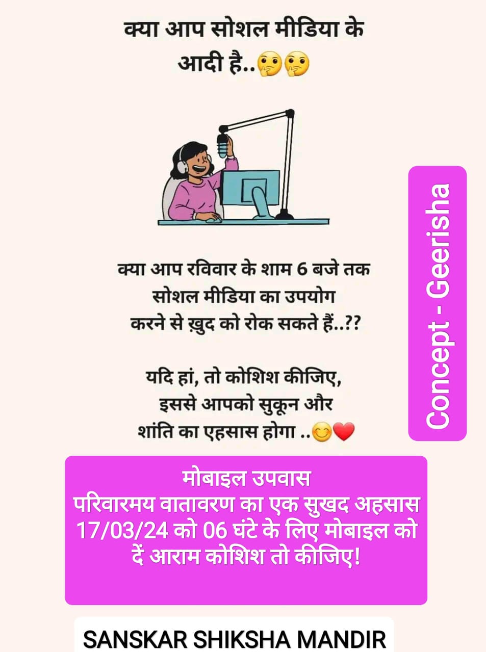 रायपुर (khabargali) हम मोबाइल का उपयोग कर रहे हैं अथवा मोबाइल हमारा उपयोग कर रहा है। इंटरनेट मोबाइल और सोशल मीडिया के जमाने में यह एक ज्वलंत प्रश्न बन गया है। सोशल मीडिया का सदुपयोग काम और दुरुपयोग ज्यादा हो रहा है। आज से 40 साल पहले का सुखद पारिवारिक वातावरण वापस लाने की जरूरत है। संस्कार शिक्षा समूह ने इस महत्व को समझते हुए रविवार 17 मार्च को 6 घंटे के लिए सोशल मीडिया उपवास की पहल की है। इसे लोगों की सकारात्मक प्रतिक्रिया समर्थन मिल रहा है। इस प्रयास को नाम दिया गया है सुकून शांति की ओर सुखद पारिवारिक जीवन को साकार करने का प्रयास।
