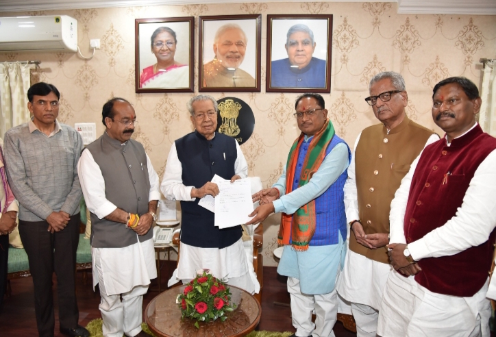 रायपुर (khabargali) राज्यपाल श्री विश्वभूषण हरिचंदन को आज यहां राजभवन में छत्तीसगढ़ राज्य भारतीय जनता पार्टी के प्रदेश अध्यक्ष श्री अरूण साव ने वर्ष 2023 की छत्तीसगढ़ राज्य नव गठित विधानसभा के अपनेे नव निर्वाचित विधायकों की सर्वसम्मति से प्रदेश विधायक दल का नेता श्री विष्णुदेव साय को चयनित किये जाने संबंधित पत्र सौंपा और नई सरकार बनाने के लिए अपना दावा प्रस्तुत किया।