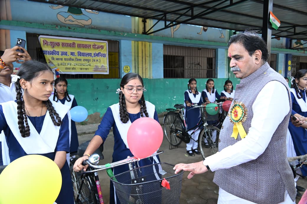 रायपुर (खबरगली) रायपुर पश्चिम विधानसभा क्षेत्र के विधायक एवं पूर्व कैबिनेट मंत्री श्री राजेश मूणत ने आज पंडित रविशंकर शुक्ल विश्वविद्यालय परिषर स्थित शासकीय उच्चतर माध्यमिक शाला में सरस्वती साइकिल योजना के अंतर्गत छात्र-छात्राओं को साइकिलों का वितरण किया।