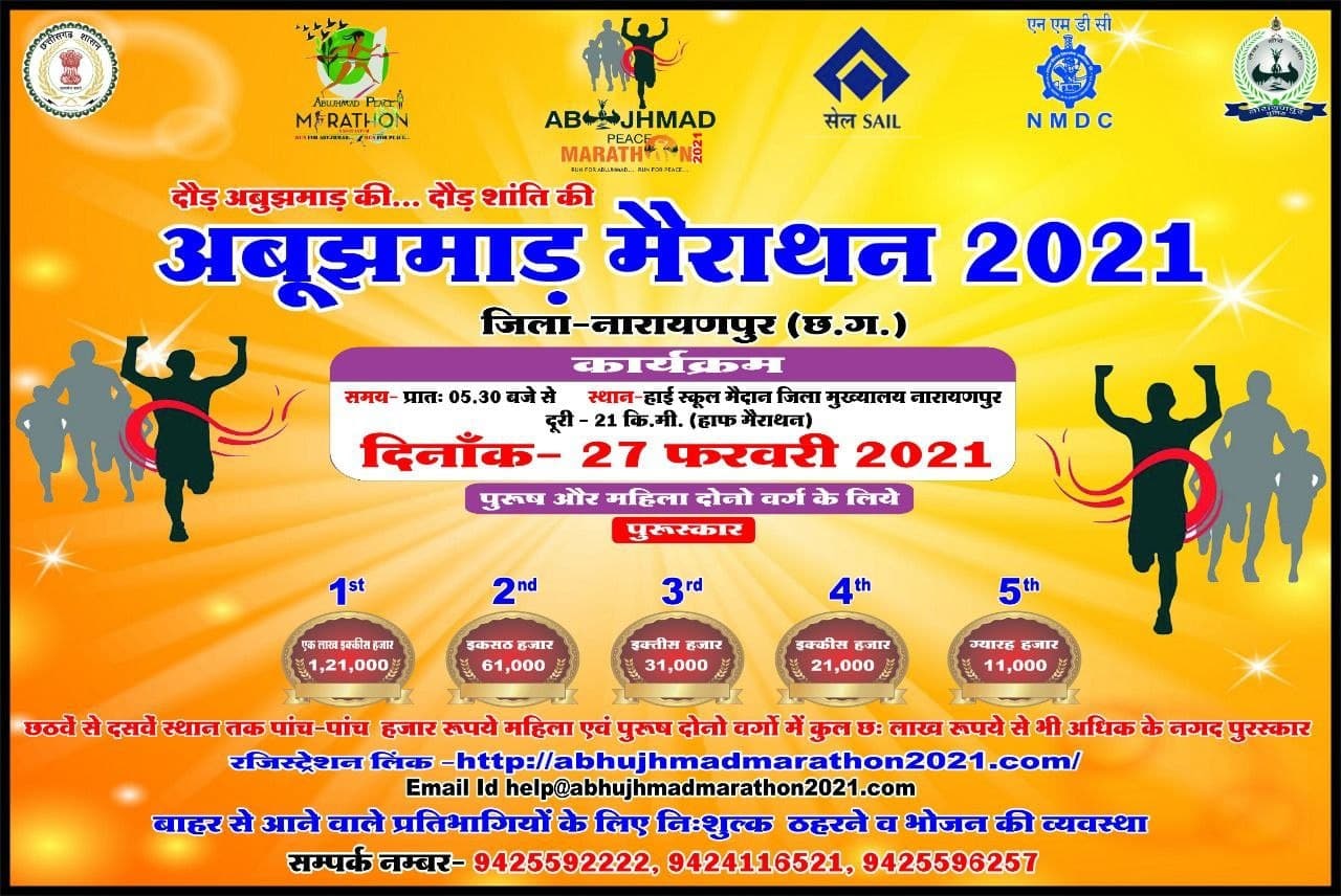 मैराथन में हिस्सा लेने के लिए इच्छुक धावक वेबसाईट http://www.abujhmadmarathon2021.com डब्ल्यूडडब्ल्यूडडब्ल्यूडॉटअबूझमाड़मैराथन2021डॉटकाम के लिंक का उपयोग कर रजिस्ट्रेशन करा सकते हैं। बाहर से आने वाले धावकों के लिए रूकने एवं भोजन की निःशुल्क व्यवस्था रहेगी। मैराथन दौड़ में महिला एवं पुरूष वर्ग के लिए अलग-अलग पुरस्कार प्रदान किए जाएंगे। प्रथम पुरस्कार 1 लाख 21 हजार रूपए, द्वितीय 61 हजार रूपए, तृतीय 31 हजार रूपए, चतुर्थ 21 हजार रूपए और पंचम पुरस्कार 11 हजार रूपए प्रदान किया जाएगा। साथ ही 6वें से 10वें नंबर पर आने वाले महिला एवं पुरूष धावकों को 5-5 हजार रूपए की पुरस्कार राशि के साथ प्रशस्ति पत्र एवं मेडल प्रदान किया जायेगा। इसके अलावा नारायणपुर जिले के महिला एवं पुरूष 10-10 धावकों को 5-5 हजार रूपए की पुरस्कार राशि के साथ प्रशस्ति पत्र एवं मेडल अलग से प्रदान किया जाएगा।