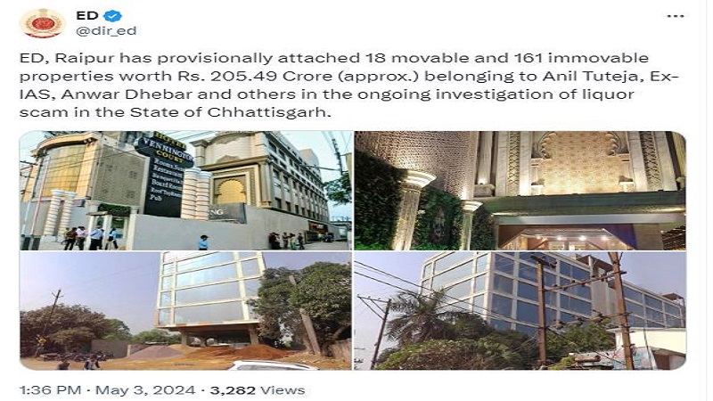 रायपुर (khabargali) छत्तीसगढ़ में आज ईडी ने बड़ी कार्रवाई करते हुए 18 चल और 161 अचल संपत्तियों को अस्थायी रूप से अटैच (जब्त) की है। बता दें कि छत्तीसगढ़ राज्य में शराब घोटाले की चल रही जांच में अनिल टुटेजा, पूर्व आईएएस, अनवर ढेबर और अन्य से संबंधित 205.49 करोड़ (लगभग) की संपत्ति ईडी ने अटैच की है।