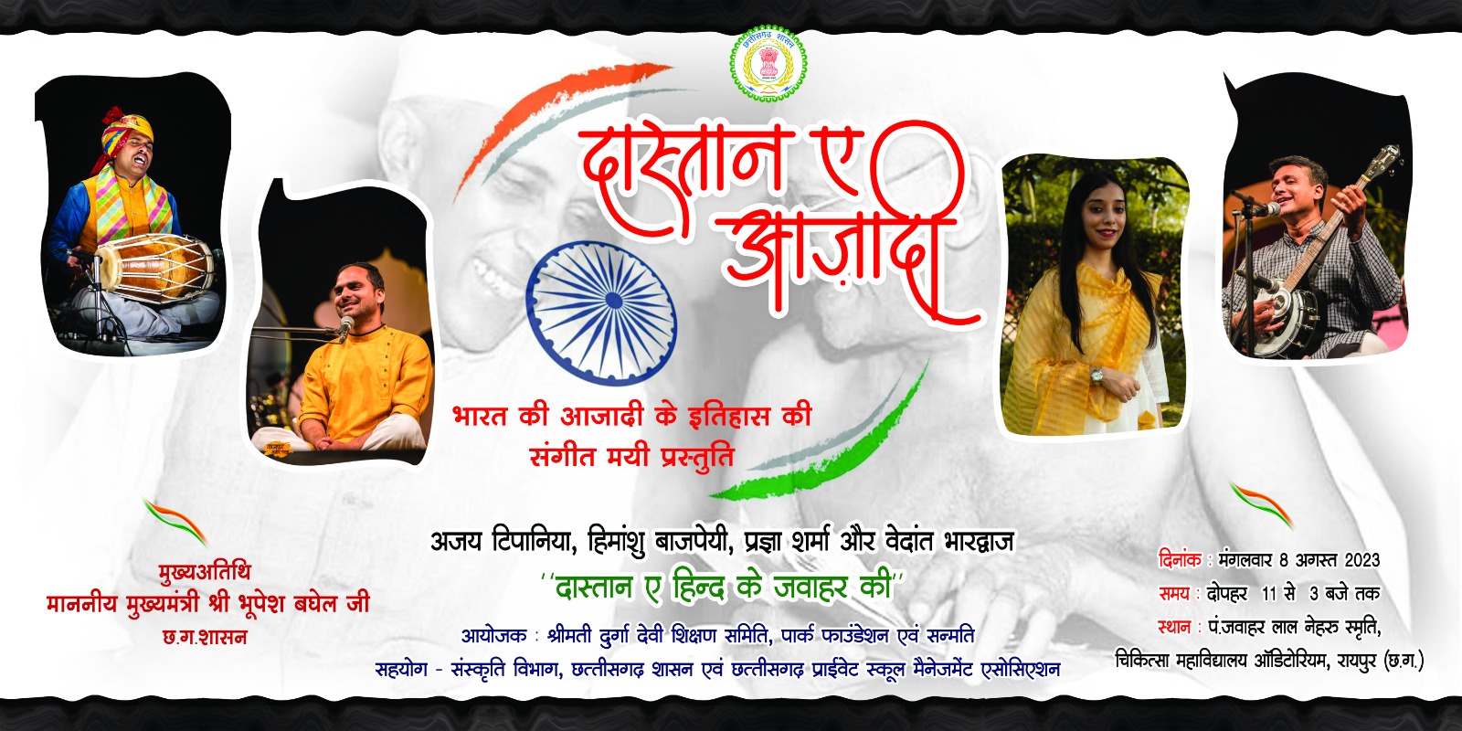 रायपुर (khabargali) पंडित जवाहरलाल नेहरू स्मृति चिकित्सा महाविद्यालय ऑडिटोरियम रायपुर में मंगलवार को दास्तान ए आजादी नाम के कार्यक्रम का आयोजन किया जा रहा है। इस कार्यक्रम में सुप्रसिद्ध किस्सागो हिमांशु बाजपेई अपनी प्रस्तुति देंगे। इनके अलावा प्रज्ञा शर्मा, अजय टिपानिया और वेदांत भारद्वाज आदि कलाकारों की भी संगीतमय प्रस्तुतियां रहेंगी।