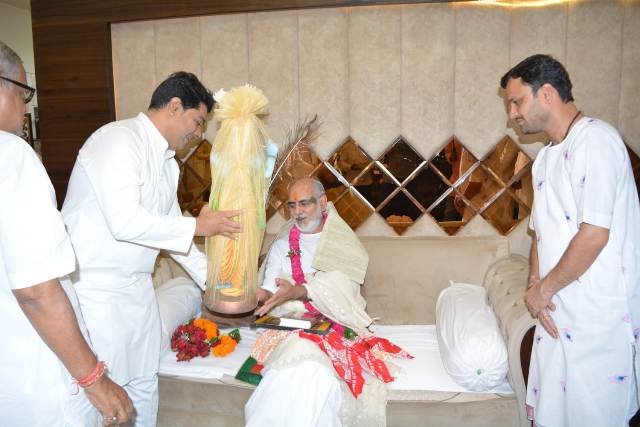 ढेबर परिवार ने श्री ओझा को भगवान श्री कृष्ण का विग्रह, श्रीमद्भागवत गीता यथारूप व श्री राधा कृष्ण चंद्र भगवान का चित्रपठ भेंट किया
